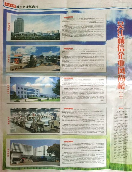 2016年4月至2017年3月,蘇州市吳江區(qū)國(guó)稅局、地稅局聯(lián)合吳江日?qǐng)?bào),開(kāi)展了“一個(gè)誠(chéng) 匯聚一座城”——吳江區(qū)誠(chéng)信納稅企業(yè)大型新聞尋訪活動(dòng),以“誠(chéng)信納稅 鑄就發(fā)展”為主題,挖掘出22家誠(chéng)信納稅企業(yè),展示吳江區(qū)納稅A級(jí)信用企業(yè)的風(fēng)采。標(biāo)準(zhǔn)菀坪榮膺其中,登上吳江區(qū)“誠(chéng)信企業(yè)風(fēng)尚榜”。