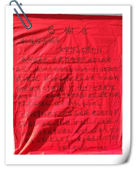 雖然大多數(shù)員工對(duì)田高志并不熟悉,可同在“標(biāo)準(zhǔn)”家園,大家依舊踴躍捐款,短短時(shí)間內(nèi),即籌集到一萬(wàn)六千余元善款。當(dāng)黨群辦同志把凝聚著沉甸甸關(guān)懷和滿滿祝福的捐款送到他手上的時(shí)候,他感動(dòng)不已,不停重復(fù)著:“感謝組織、感謝公司,感謝同事們……”