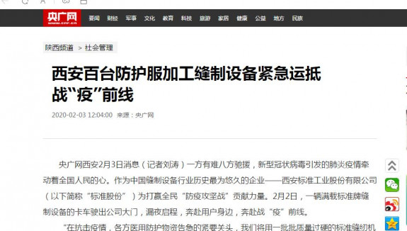 央廣網西安2月3日消息(記者劉濤)一方有難八方馳援,新型冠狀病毒引發(fā)的肺炎疫情牽動著全國人民的心。作為中國縫制設備行業(yè)歷史最為悠久的企業(yè)——西安標準工業(yè)股份有限公司(以下簡稱“標準股份”)為打贏全民“防疫攻堅戰(zhàn)”貢獻力量。2月2日,一輛滿載標準牌縫制設備的卡車駛出公司大門,漏夜啟程,奔赴用戶身邊,奔赴戰(zhàn)“疫”前線。